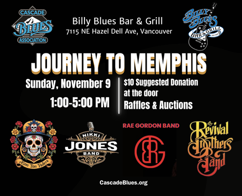 The Cascade Blues Association is gearing up for our annual Journey to Memphis Fundraisers— and you’re invited to join the celebration! These event helps send our 2025 winners, Lilla (Solo/Duo) and The Nikki Jones Band (Band) to the International Blues Challenge in Memphis, Tennessee this January.